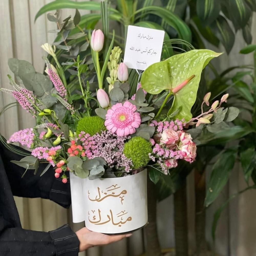بوكس ورد هو تنسيق زهري فاخر مثالي لتقديم تهاني البيت الجديد. يحتوي البوكس على مجموعة من الورود المتنوعة مثل جيربيرا وردية، توليب، وأنثوريوم، مرتبة بعناية في مزهرية بيضاء مكتوب عليها "منزل مبارك". تصميم البوكس يضفي لمسة جمالية ويعبر عن التقدير والمباركة بطريقة راقية وجذابة.